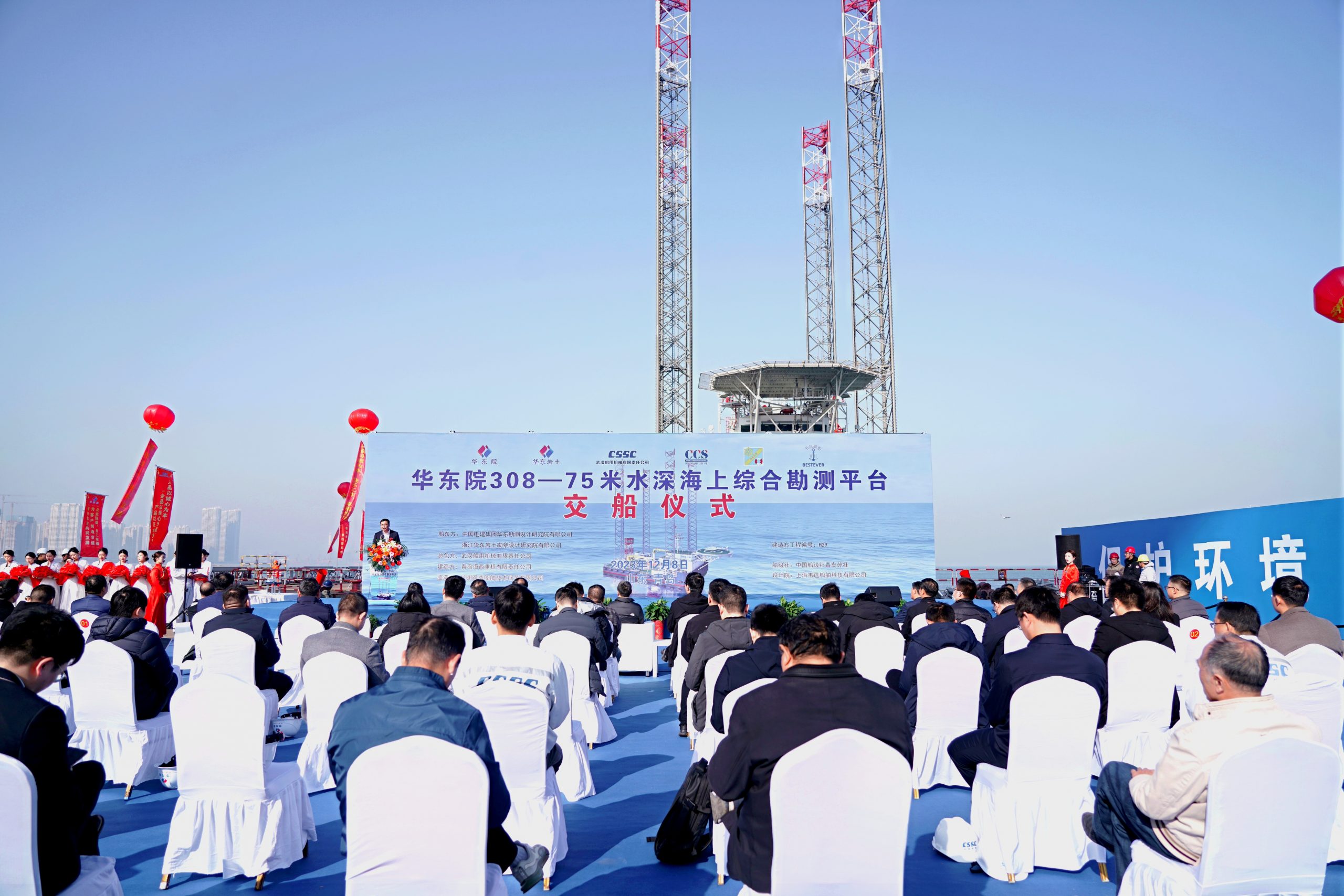 劉加進代表華東院致辭,他指出海洋是國家綜合國力競爭的重要領域,華東院在海洋科技創新、裝備革新上持續投入,并依托“華東院308”平臺研發,完成多項核心技術攻關任務,形成了系列科研成果,為國內深遠海技術裝備建設樹立了新標桿。“華東院308”平臺的投產,將進一步提升我院海洋裝備和技術水平,為行業發展更好地貢獻華東院智慧和解決方案,為建設海洋強國作出新貢獻。